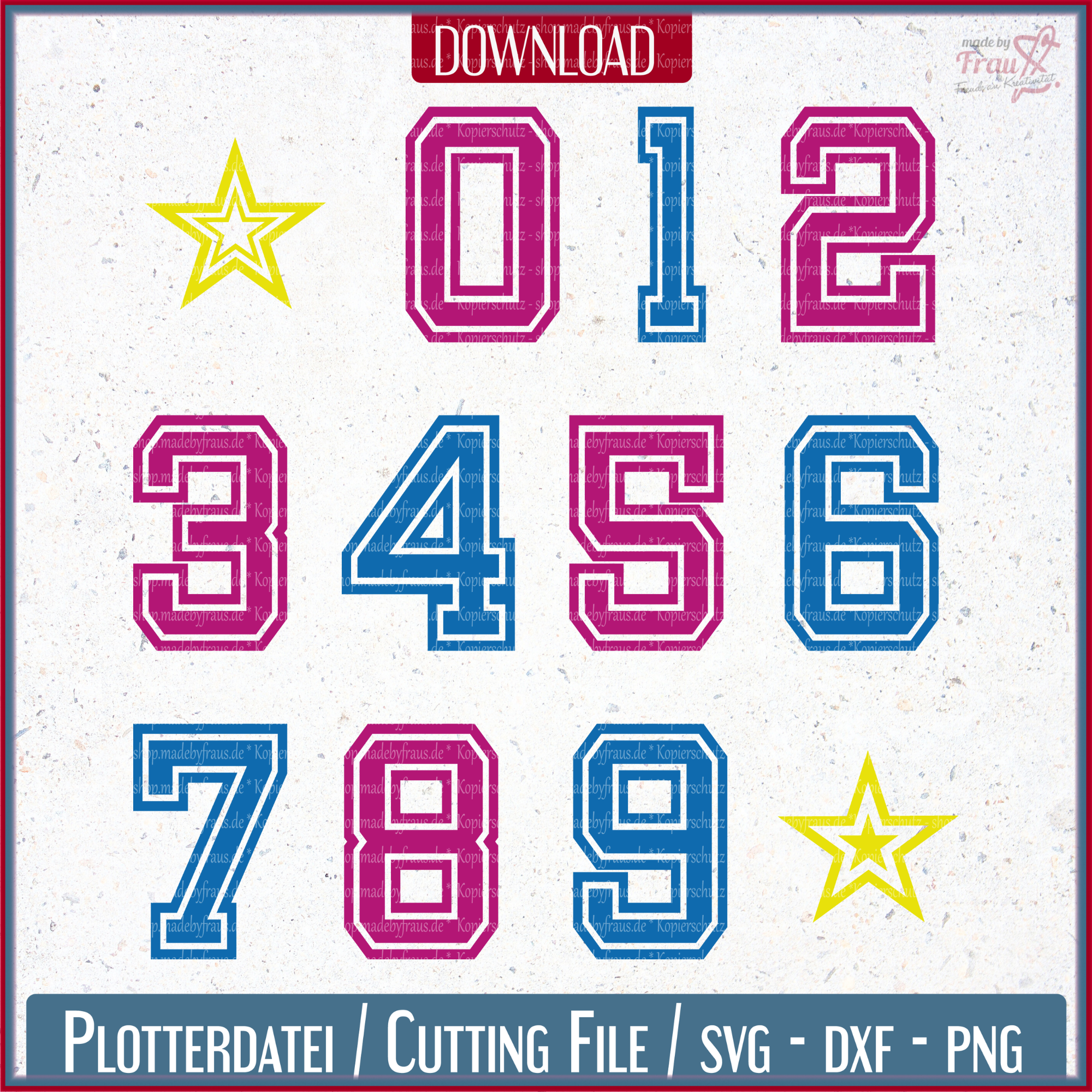 Die markanten Zahlen im typischen College-Look und die zwei passenden Sterne machen deine Projekte zu echten Highlights.